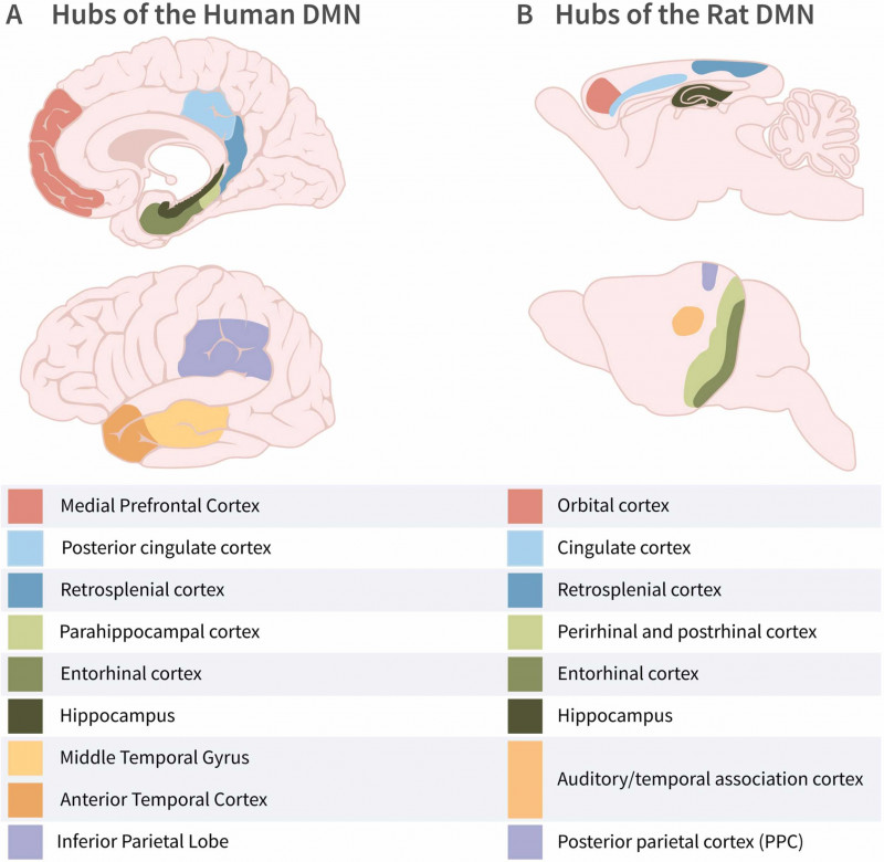 Fig. 1 of the publication: Cortical structures associated with the default mode network (DMN) in the human and rat brain.